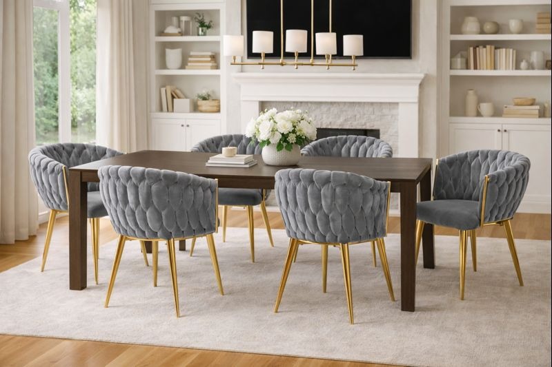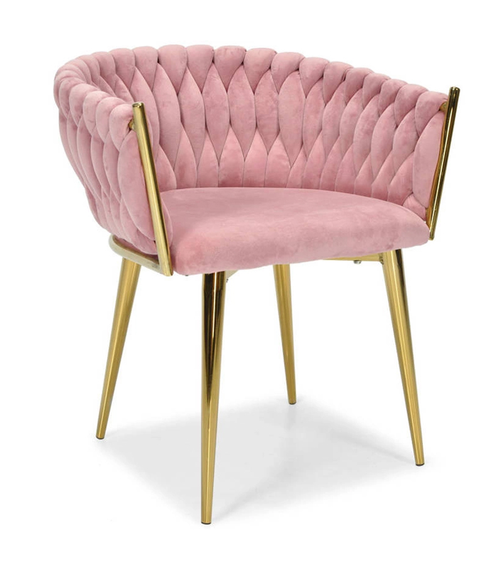 Wyróżnikiem modelu jest pleciona tapicerka 3D na oparciu, która wygląda jak dekoracyjne pikowanie i sprawia, że krzesło przyciąga spojrzenia w jadalni, salonie czy przy toaletce. Kubełkowy kształt z podłokietnikami delikatnie otula sylwetkę, dzięki czemu siedzi się wygodnie także podczas dłuższych spotkań przy stole.